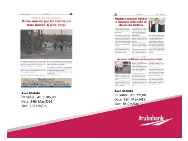 Awe Mainta Awe Mainta PR Value : Afl. 1.685,00 PR Value : Afl. 795,00 Date: 24th May,2019 Date: 25th May,2019 Size: 105 Cm/Col Size: 85 Cm/Col