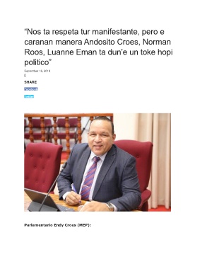 “Nos ta respeta tur manifestante, pero e caranan manera Andosito Croes, Norman Roos, Luanne Eman ta dun’e un toke hopi politico” September 16, 2019 0 SHARE Facebook Twitter Parlamentario Endy Croes (MEP):
