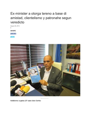 Ex-minister a otorga tereno a base di amistad, clientelismo y patronahe segun veredicto August 29, 2019 0 SHARE Facebook Twitter - Advertisement - Gobierno a gana 27 caso den Corte: