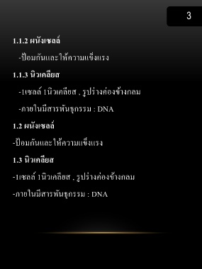 3 1.1.2 ผนังเซลล์ -ป้ อมกันและให้ความแข็งแรง 1.1.3 นิวเคลียส -1เซลล์ 1นิวเคลียส , รูปร่างค่องข้างกลม -ภายในมีสารพันธุกรรม : DNA 1.2 ผนังเซลล์ -ป้ อมกันและให้ความแข็งแรง 1.3 นิวเคลียส -1เซลล์ 1นิวเคลียส , รูปร่างค่องข้างกลม -ภายในมีสารพันธุกรรม : DNA