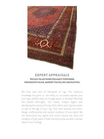 WE CAN VALUE RUGS FOR MANY PURPOSES: INSURANCE VALUE, MARKET VALUE, OR LIQUIDATION.
