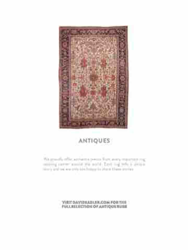 ANTIQUES We proudly offer authentic pieces from every important rug weaving center around the world. Each rug tells a unique story and we are only too happy to share these stories. VISIT DAVIDEADLER.COM FOR THE FULL SELECTION OF ANTIQUE RUGS