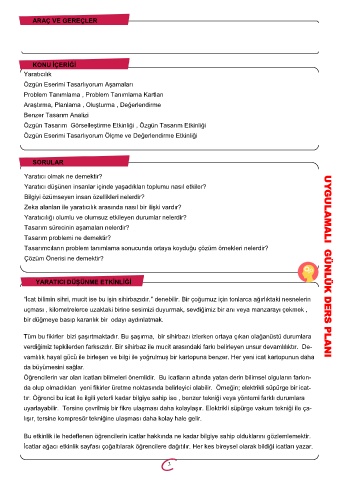 YARATICI DÜŞÜNME ETKİNLİĞİ UYGULAMALI GÜNLÜK DERS PLANI