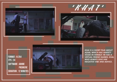 ‘ K H A I ’ KHAI IS A SHORT FILM ABOUT AZAM, WHICH HAS ANXIETY ISSUES IN HIMSELF. HE HAS A format : h.264 VIRTUAL FRIEND NAMED, KHAI, fps : 24 WHO ALWAYS GIVE HIM NEGATIVE VIBE AND ADVICE. software : adobe premiere duration : 12 MINUTES