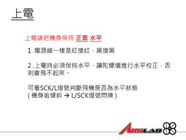 上電 上電請把機身保持 正面 水平 1 .電源線一樣是紅接紅,黑接黑 2 .上電時必須保持水平,讓陀螺儀進行水平校正,否 則會飛不起來。 可看SCK/L燈號判斷飛機是否為水平狀態 ( 機身若傾斜 L/SCK燈號閃爍 )