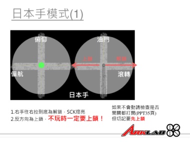 日本手模式(1) 俯仰 油門 上鎖 解鎖 偏航 滾轉 如果不會動請檢查是否 1.右手往右拉到底為解鎖,SCK燈亮 開關都打開(PPT35頁) 2.反方向為上鎖,不玩時一定要上鎖! 但切記要先上鎖