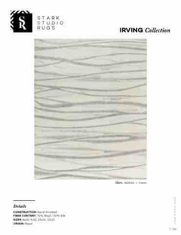 STARK STUDIO RUGS 2021 Details CONSTRUCTION: Hand-Knotted FIBER CONTENT: 70% Wool / 30% Silk SIZES: 8x10, 9x12, 10x14, 12x15 ORIGIN: Nepal IRVING Collection 1 Maris 125144A — Cream 103 STARK STUDIO RUGS