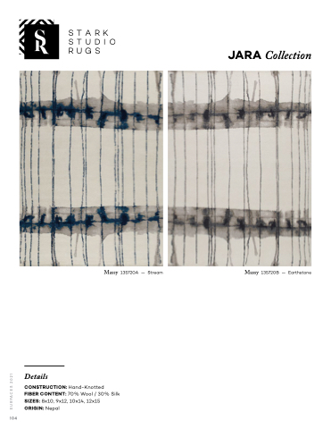 STARK STUDIO RUGS 2021 JARA Collection 1 Massy 135720A — Stream Massy 135720B — Earthstone 104 Details CONSTRUCTION: Hand-Knotted FIBER CONTENT: 70% Wool / 30% Silk SIZES: 8x10, 9x12, 10x14, 12x15 ORIGIN: Nepal SURFACES 2021