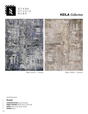 STARK STUDIO RUGS 2021 KEILA Collection 1 Aeson 133011A — Amethyst Aeson 133011B — Sandstone 106 Details CONSTRUCTION: Hand-Knotted FIBER CONTENT: 80% Wool / 20% Silk SIZES: 8x10, 9x12, 10x14, 12x15 ORIGIN: India SURFACES 2021