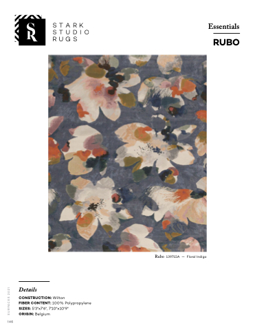 STARK STUDIO RUGS 2021 Essentials RUBO 1 146 Details CONSTRUCTION: Wilton FIBER CONTENT: 100% Polypropylene SIZES: 5'3"x7'6", 7'10"x10'9" ORIGIN: Belgium Rubo 139715A — Floral Indigo SURFACES 2021