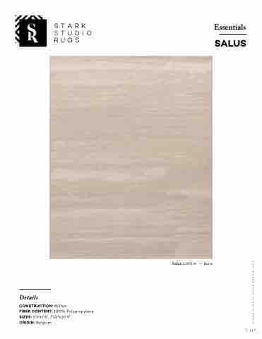 STARK STUDIO RUGS 2021 Essentials SALUS 1 Details CONSTRUCTION: Wilton FIBER CONTENT: 100% Polypropylene SIZES: 5'3"x7'6", 7'10"x10'9" ORIGIN: Belgium Salus 139717A — Bone 147 STARK STUDIO RUGS ESSENTIALS