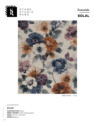 STARK STUDIO RUGS 2021 Essentials SOLAL 1 148 Details CONSTRUCTION: Wilton FIBER CONTENT: 100% Polypropylene SIZES: 5'3"x7'6", 7'10"x10'9" ORIGIN: Belgium Solal 139716A — Floral SURFACES 2021