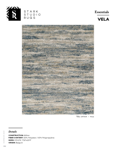 STARK STUDIO RUGS 2021 Essentials VELA 1 152 Details CONSTRUCTION: Wilton FIBER CONTENT: 55% Polyester / 45% Polypropylene SIZES: 5'3"x7'6", 7'10"x10'9" ORIGIN: Belgium Vela 139720A — Moss SURFACES 2021