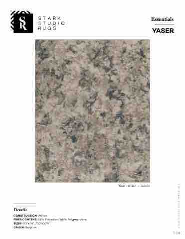 STARK STUDIO RUGS 2021 Essentials YASER 1 Details CONSTRUCTION: Wilton FIBER CONTENT: 55% Polyester / 45% Polypropylene SIZES: 5'3"x7'6", 7'10"x10'9" ORIGIN: Belgium Yaser 139721A — Granite 153 STARK STUDIO RUGS ESSENTIALS