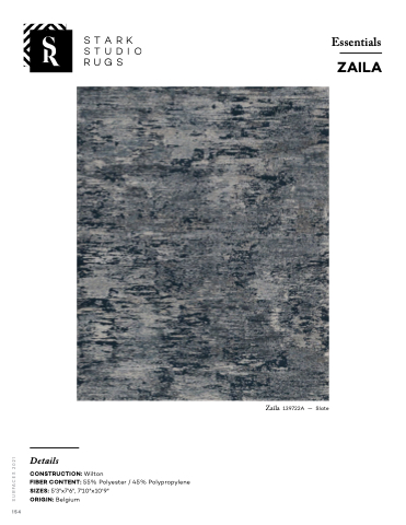 STARK STUDIO RUGS 2021 Essentials ZAILA 1 154 Details CONSTRUCTION: Wilton FIBER CONTENT: 55% Polyester / 45% Polypropylene SIZES: 5'3"x7'6", 7'10"x10'9" ORIGIN: Belgium Zaila 139722A — Slate SURFACES 2021