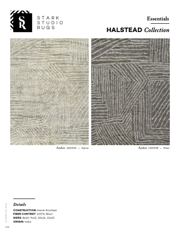 STARK STUDIO RUGS 2021 Essentials HALSTEAD Collection 1 Anders 135290A — Alpine Anders 135290B — Maze 156 Details CONSTRUCTION: Hand-Knotted FIBER CONTENT: 100% Wool SIZES: 8x10, 9x12, 10x14, 12x15 ORIGIN: India SURFACES 2021