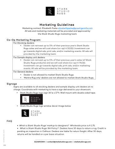 • Dealer can reinvest up to 5% of their previous year’s Stark Studio Rugs sales and we will cost share (co-op) it 50/50. Investment can go towards digital ads, print ads, and/or marketing events. All ads will provided by the marketing team.