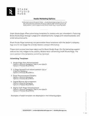 Stark Studio Rugs offers advertising templates for dealers who are interested in featuring Stark Studio Rugs through 1 page print advertisements, 2 page print advertisements, and email announcements.