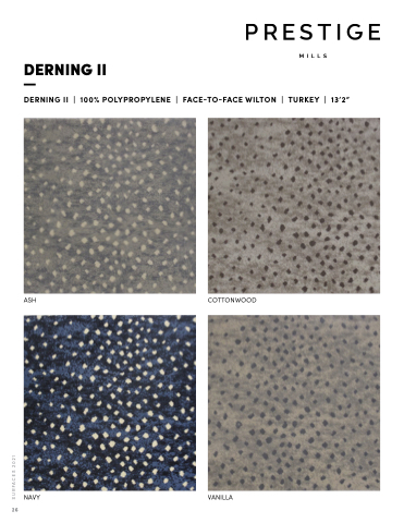 PRESTIGE MILLS 2021 DERNING II DERNING II | 100% POLYPROPYLENE | FACE-TO-FACE WILTON | TURKEY | 13’2” ASH COTTONWOOD NAVY VANILLA 26 SURFACES 2021