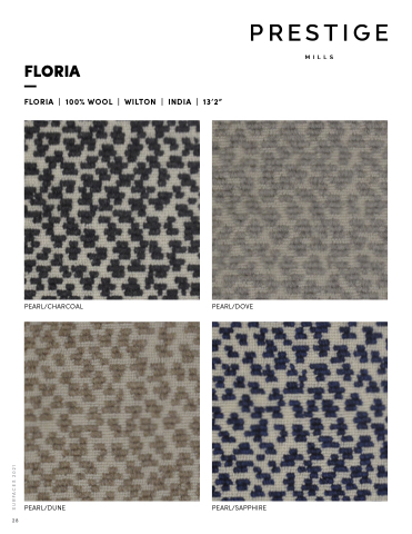 PRESTIGE MILLS 2021 FLORIA FLORIA | 100% WOOL | WILTON | INDIA | 13’2” PEARL/CHARCOAL PEARL/DOVE 28 PEARL/DUNE PEARL/SAPPHIRE SURFACES 2021