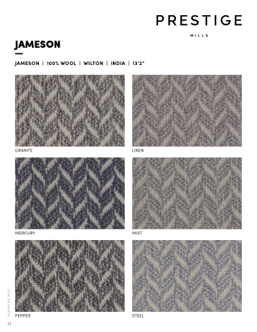 PRESTIGE MILLS 2021 JAMESON JAMESON | 100% WOOL | WILTON | INDIA | 13’2” GRANITE LINEN MERCURY MIST 32 PEPPER STEEL SURFACES 2021
