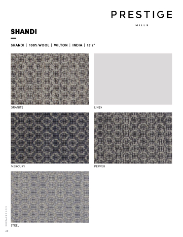 42 PRESTIGE MILLS 2021 SHANDI SHANDI | 100% WOOL | WILTON | INDIA | 13’2” GRANITE LINEN MERCURY PEPPER STEEL SURFACES 2021
