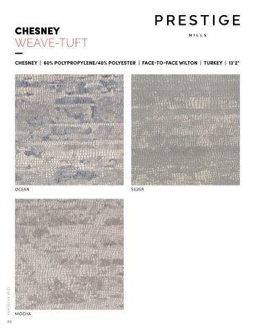 PRESTIGE MILLS 2021 CHESNEY CHESNEY | 60% POLYPROPYLENE/40% POLYESTER | FACE-TO-FACE WILTON | TURKEY | 13’2” OCEAN SILVER MOCHA 50 SURFACES 2021