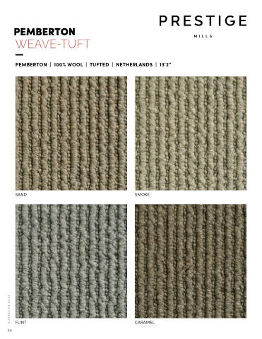 56 PRESTIGE MILLS 2021 PEMBERTON PEMBERTON | 100% WOOL | TUFTED | NETHERLANDS | 13’2” SAND SMOKE FLINT CARAMEL SURFACES 2021
