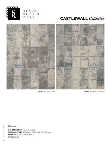 CASTLEWALL Collection STARK STUDIO RUGS 2021 1 Siwani 125771B — Sky Siwani 125771C — Shadow 92 Details CONSTRUCTION: Hand-Knotted FIBER CONTENT: 50% Wool / 40% Silk / 10% Linen SIZES: 8x10, 9x12, 10x14, 12x15 ORIGIN: India SURFACES 2021