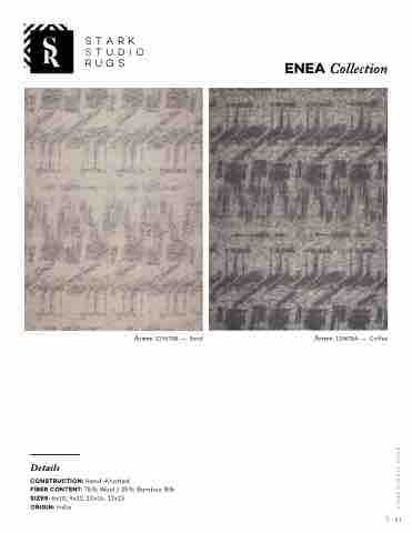 STARK STUDIO RUGS 2021 ENEA Collection 1 Arwen 129678B — Sand Arwen 129678A — Coffee Details CONSTRUCTION: Hand-Knotted FIBER CONTENT: 75% Wool / 25% Bamboo Silk SIZES: 8x10, 9x12, 10x14, 12x15 ORIGIN: India 93 STARK STUDIO RUGS