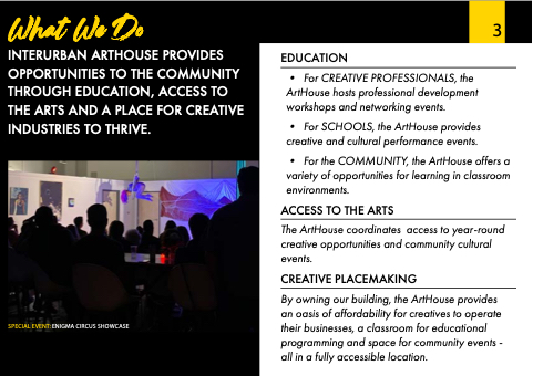 INTERURBAN ARTHOUSE PROVIDES OPPORTUNITIES TO THE COMMUNITY THROUGH EDUCATION, ACCESS TO THE ARTS AND A PLACE FOR CREATIVE INDUSTRIES TO THRIVE.