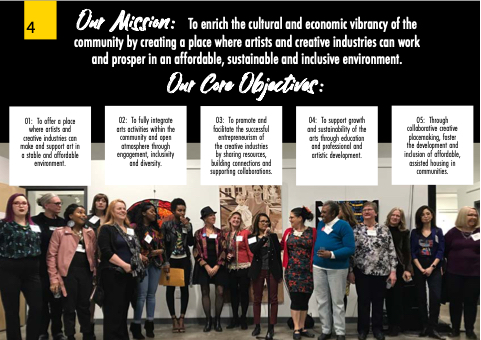 Our Mission: To enrich the cultural and economic vibrancy of the community by creating a place where artists and creative industries can work and prosper in an affordable, sustainable and inclusive environment.