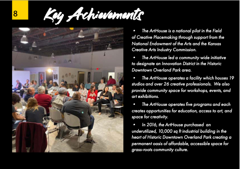 • The ArtHouse is a national pilot in the Field of Creative Placemaking through support from the National Endowment of the Arts and the Kansas Creative Arts Industry Commission.