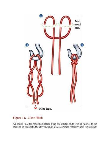 Figure 14. Clove Hitch A popular knot for mooring boats to piers and pilings and securing ratlines to the shrouds on sailboats, the clove hitch is also a common “starter” knot for lashings
