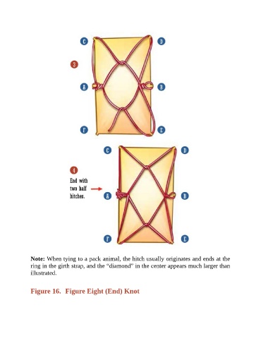 Note: When tying to a pack animal, the hitch usually originates and ends at the ring in the girth strap, and the “diamond” in the center appears much larger than illustrated. Figure 16. Figure Eight (End) Knot