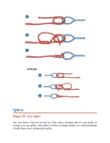 Splices Figure 39. Eye Splice You can form a loop at the end of a line with a bowline, but it’s not nearly as strong as an eye splice. And when it comes to beauty, there’s no contest between a bulky knot and a symmetrical splice.