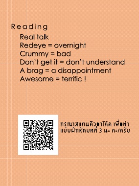R e a d i n g Real talk Redeye = overnight Crummy = bad Don’t get it = don’t understand A brag = a disappointment Awesome = terrific ! กรุณาสแกนคิวอาโค้ด เพื่อท า แบบฝึกหัดบทที่ 3 นะ คะ/ครับ