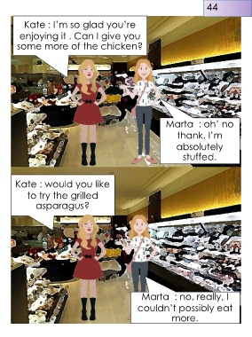 44 Kate : I’m so glad you’re enjoying it . Can I give you some more of the chicken? Marta : oh’ no thank. I’m absolutely stuffed. Kate : would you like to try the grilled asparagus? Marta : no, really, I couldn’t possibly eat more.