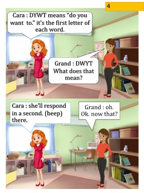4 Cara : DYWT means “do you want to.” it’s the first letter of each word. Grand : DWYT What does that mean? Cara : she’ll respond Grand : oh. in a second. (beep) Ok. now that? there.