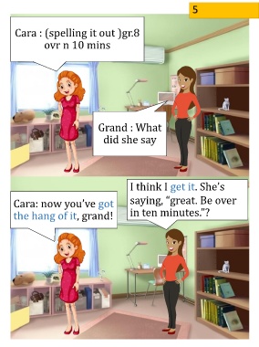 5 Cara : (spelling it out )gr.8 ovr n 10 mins Grand : What did she say I think I get it. She’s Cara: now you’ve got saying, “great. Be over the hang of it, grand! in ten minutes.”?