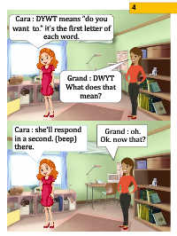 4 Cara : DYWT means “do you want to.” it’s the first letter of each word. Grand : DWYT What does that mean? Cara : she’ll respond Grand : oh. in a second. (beep) Ok. now that? there.