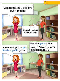 5 Cara : (spelling it out )gr.8 ovr n 10 mins Grand : What did she say I think I get it. She’s Cara: now you’ve got saying, “great. Be over the hang of it, grand! in ten minutes.”?