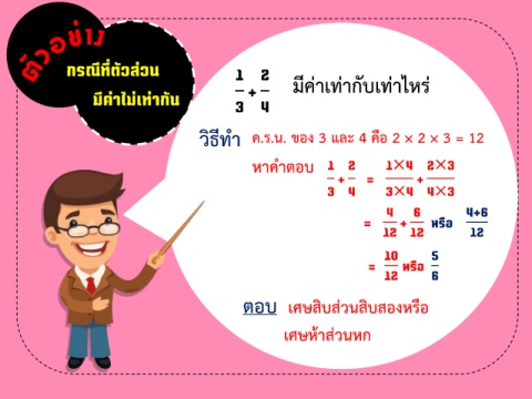 กรณีที่ตัวส่วน 1 2 มีค่ำเท่ำกับเท่ำไหร่ + มีค่าไม่เท่ากัน 3 4 วิธีท ำ ค.ร.น. ของ 3 และ 4 คือ 2 × 2 × 3 = 12 หำค ำตอบ 1 2 1×4 2×3 + = + 3 4 3×4 4×3 4 6 4+6 = + หรือ 12 12 12 10 5 = หรือ 12 6 ตอบ เศษสิบส่วนสิบสองหรือ เศษห้ำส่วนหก