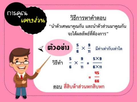 วิธีกำรหำค ำตอบ “น ำตัวเศษมำคูณกัน และน ำตัวส่วนมำคูณกัน จะได้ผลลัพธ์ที่ต้องกำร” 5 × 9 มีค่ำเท่ำกับเท่ำใด 6 5 9 5×9 วิธีท ำ × = 6 6× 45 = 66 ตอบ สี่สิบห้ำส่วนหกสิบหก