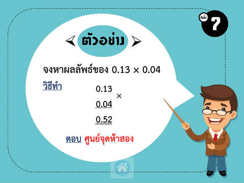 7 จงหำผลลัพธ์ของ 0.13 × 0.04 วิธีท ำ 0.13 × 0.04 0.52 ตอบ ศูนย์จุดห้ำสอง