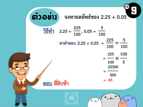 9 จงหำผลลัพธ์ของ 2.25 ÷ 0.05 225 5 วิธีท ำ 2.25 = , 0.05 = 100 100 225 5 หำค ำตอบ 2.25 ÷ 0.05 = ÷ 100 100 225 100 = × 100 5 22500 = 500 = 45 ตอบ สี่สิบห้ำ