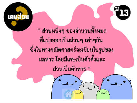 13 เศษส่วน “ ส่วนหนึ่งๆ ของจ ำนวนทั้งหมด ที่แบ่งออกเป็นส่วนๆ เท่ำๆกัน ซึ่งในทำงคณิตศำสตร์จะเขียนในรูปของ ผลหำร โดยมีเศษเป็นตัวตั้งและ ส่วนเป็นตัวหำร ”
