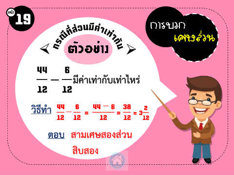 19 44 6 − มีค่ำเท่ำกับเท่ำไหร่ 12 12 วิธีท ำ 44 − 6 = 44 − 6 38 = 3 2 = 12 12 12 12 12 ตอบ สำมเศษสองส่วน สิบสอง
