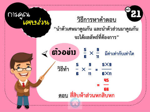 21 วิธีกำรหำค ำตอบ “น ำตัวเศษมำคูณกัน และน ำตัวส่วนมำคูณกัน จะได้ผลลัพธ์ที่ต้องกำร” 5 × 9 มีค่ำเท่ำกับเท่ำใด 6 5 9 5×9 วิธีท ำ × = 6 6× 45 = 66 ตอบ สี่สิบห้ำส่วนหกสิบหก
