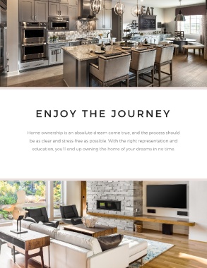 E N J O Y T H E J O U R N E Y Home ownership is an absolute dream come true, and the process should be as clear and stress-free as possible. With the right representation and education, you'll end up owning the home of your dreams in no time.